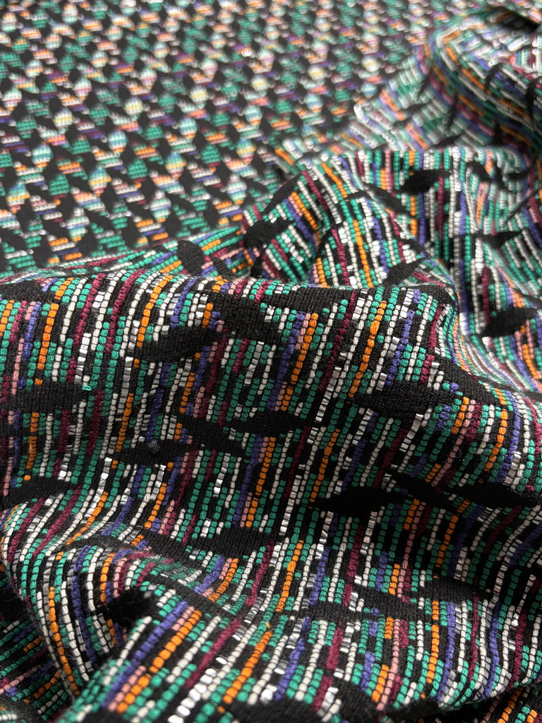 Color: Jet Black, Emerald Green, Dark Red Plum, Violet, Persimmon Orange. Fiber content: cotton, viscose, polyamide, metallic. Width: 60''