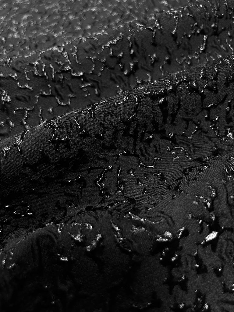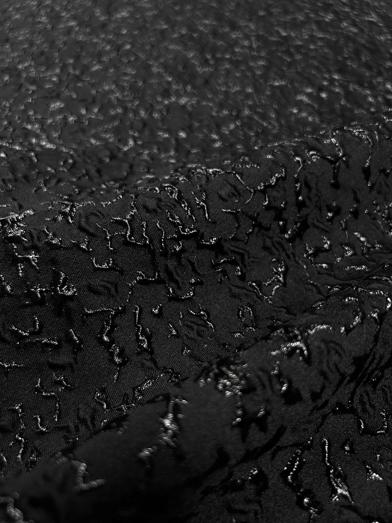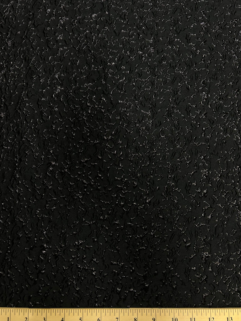 This Designer Metallic Virgin Wool Silk Blend Jacquard from Italy blends luxury with a flashy metallic twist. With a fine organdy touch, this jacquard holds its shape beautifully. The mix of jet black and shimmering metallic black creates a dazzling depth perfect for sharp jackets, chic skirts, cocktail dresses, or show-stopping outfits. Add a splash of sparkle and sophistication to your wardrobe with this fabric that plays as stylish as you do!