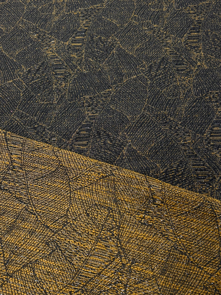 This reversible jacquard from France shines with a metallic leaf-like pattern that’s both bold and versatile. It catches light with a soft shimmer, highlighting a mix of jet black, mustard yellow, and silver. With two distinct sides to choose from, it’s perfect for making statement jackets, tailored skirts, or standout eveningwear. Its textured design and sparkling finish add a playful twist of modern sophistication to any outfit.