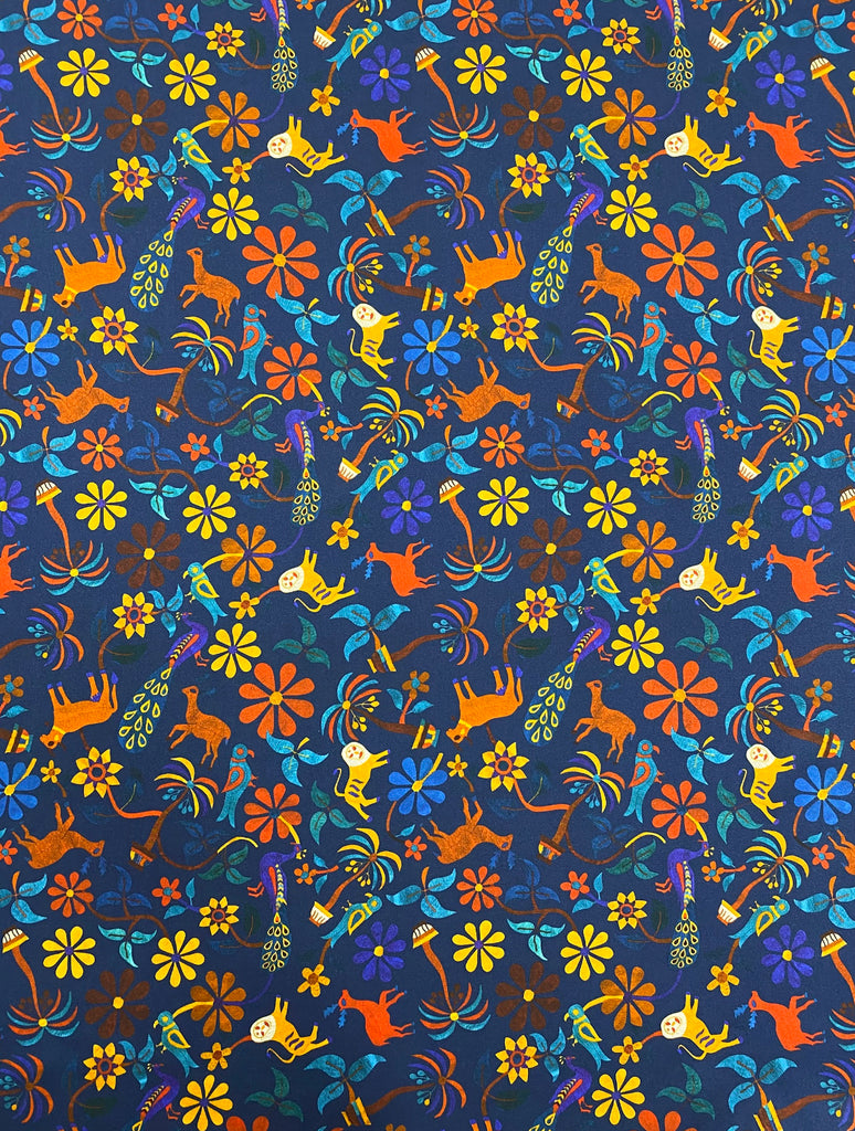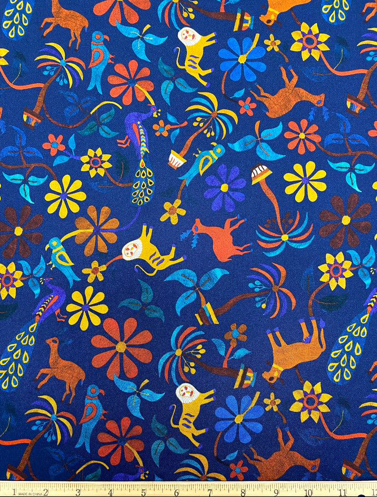 Color: multicolored print, ocean blue background.